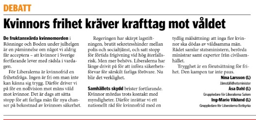 I Mitt i Botkyrka/Salem publicerades nyligen en debattartikel undertecknad av Ing-Marie Viklind, gruppledare för Liberalerna Botkyrka, tillsammans med Nina Larsson, jämställdhetsminister (L), och Åsa Dahl, gruppledare för Liberalerna i Salem. De lyfter en av vår tids viktigaste frihetsfrågor: rätten att leva utan våld, hot och förtryck.